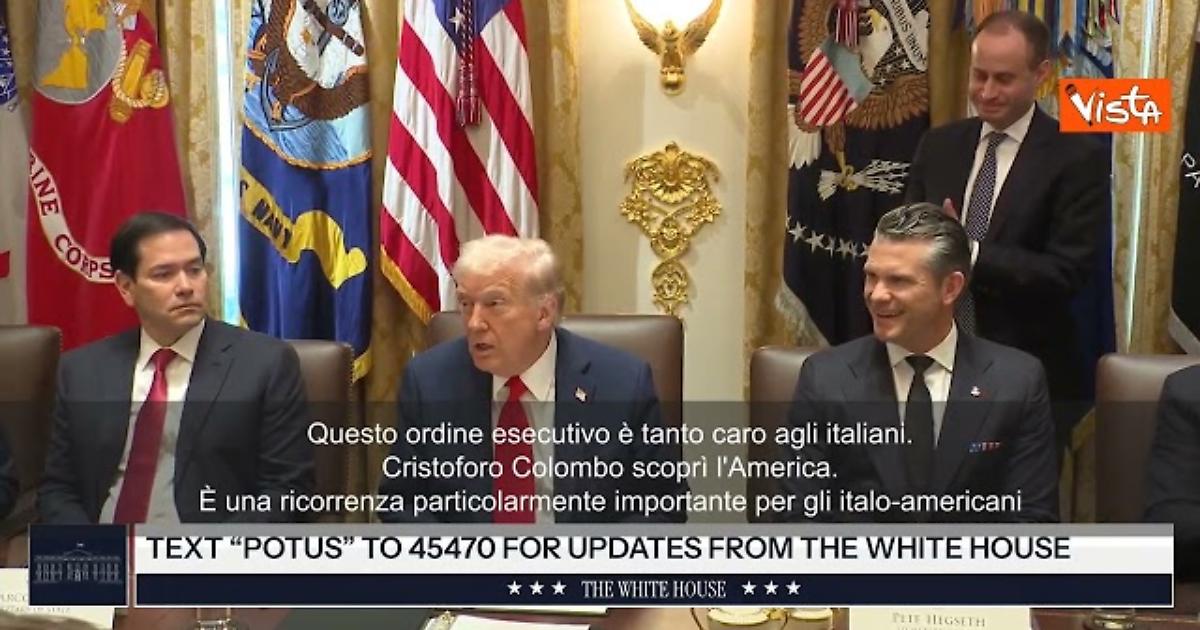 Donald Trump ha firmato la proclamazione per la festa di Cristoforo Colombo, tanto cara alla comunità italo-americana, all'inizio della riunione di gabinetto alla Casa Bianca. "Amiamo gli italiani", ha detto. La festa era stata sostituita dalla Giornata dell'indigeno durante il Governo Biden dopo le accese proteste woke.