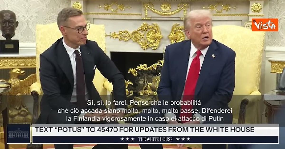 "Sì, sì, lo farei. Penso che le probabilità che ciò accada siano molto, molto, molto basse. Difenderei la Finlandia vigorosamente in caso di attacco di Putin", lo ha detto il Presidente usa Donald Trump ricevendo il premier finlandese Stubb alla Casa Bianca.