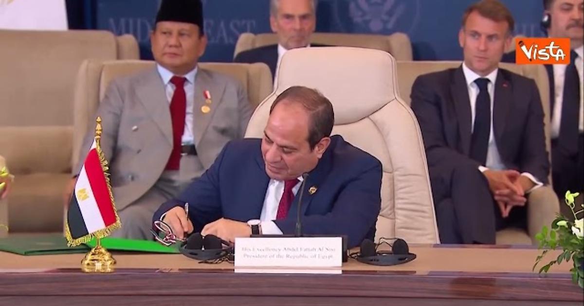 Donald Trump ha firmato l'accordo di pace per Gaza a Sharm el Sheik insieme al Presidente egiziano al Sisi, al Presidente turco Erdogan e al premier del Qatar Al Thani, tutti Paesi mediatori dell'accordo. Il pubblico ha tributato un applauso.