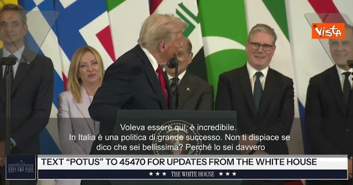 (Agenzia Vista) Egitto, 13 ottobre 2025 "Abbiamo qui una giovane donna. Non mi sarebbe permesso dirlo - negli Stati Uniti, di solito, è la fine della carriera se lo fai - ma correrò il rischio: è una donna giovane e bellissima. Voleva essere qui, è incredibile. In Italia è una politica di grande successo. Non ti dispiace se dico che sei bellissima? Perché lo sei davvero". Così il presidente americano Donald Trump, rivolgendosi alla premier italiana Giorgia Meloni a margine del summit sulla pace in Medio Oriente. WhiteHouse Fonte: Agenzia Vista / Alexander Jakhnagiev