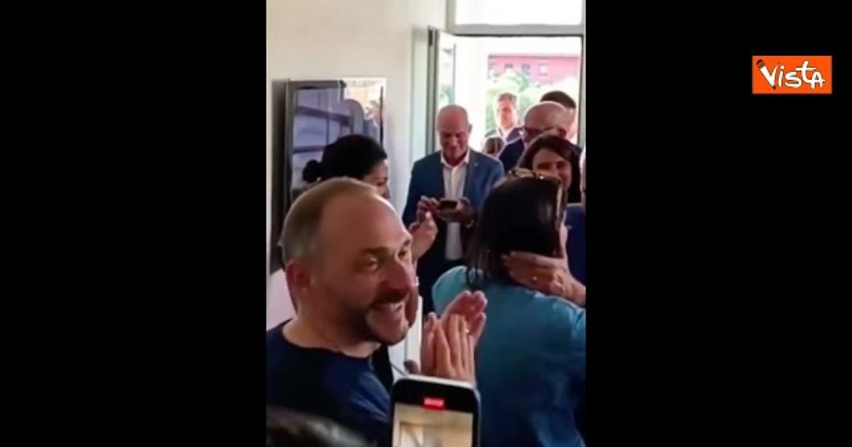 La segretaria del Pd Elly Schlein abbraccia Eugenio Giani dopo la rielezione alle Regionali toscane.