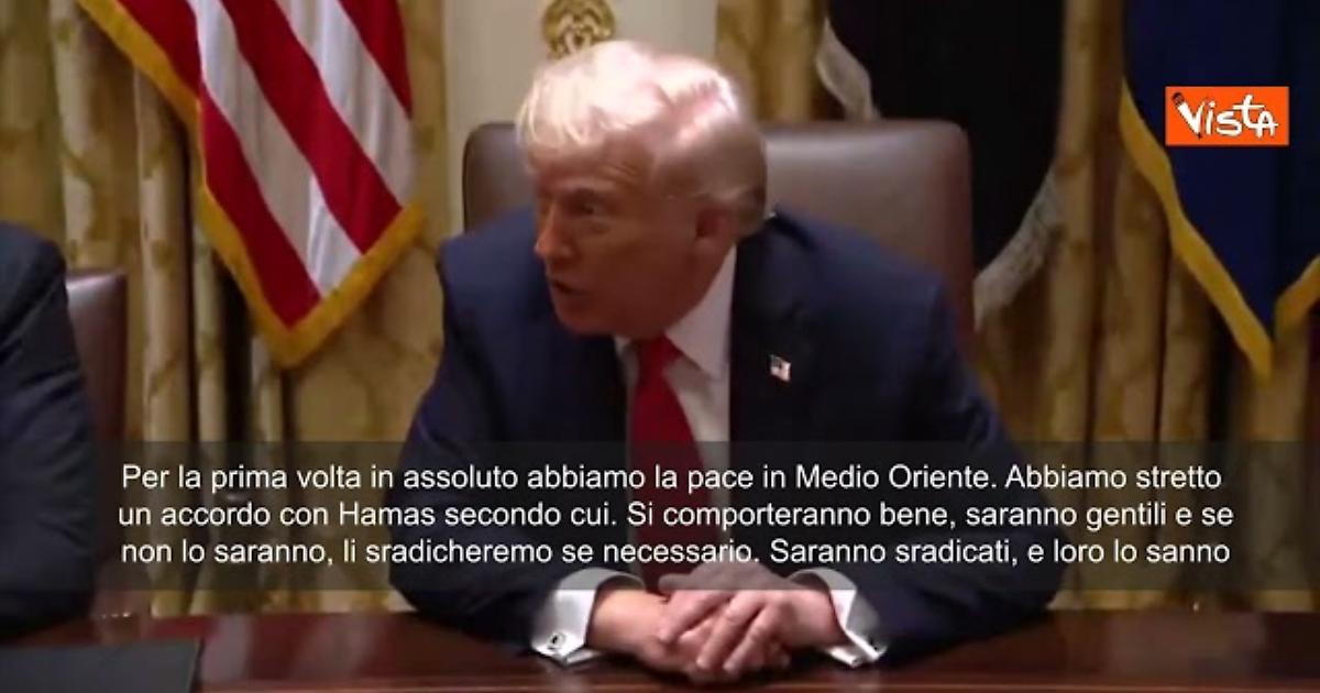 "Per la prima volta in assoluto abbiamo la pace in Medio Oriente. Abbiamo stretto un accordo con Hamas secondo cui. Si comporteranno bene, saranno gentili, e se non lo saranno, li sradicheremo se necessario. Saranno sradicati, e loro lo sanno". Così Trump parlando con i cronisti alla Casa Bianca.