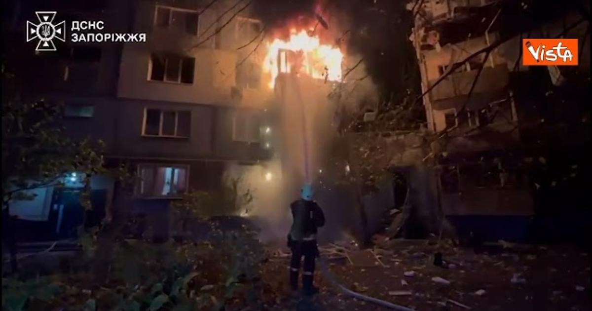 Palazzi in fiamme dopo l'impatto di un drone russo a Kharkiv. Colpito anche un asilo.