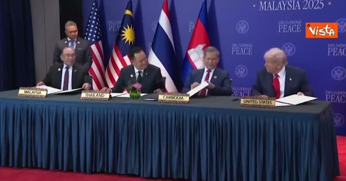 Il Presidente americano Donald Trump ha assistito alla firma di un accordo di cessate il fuoco tra Cambogia e Thailandia a Kuala Lumpur, in Malesia, dove è giunto oggi per partecipare al vertice dell'Associazione delle Nazioni del Sudest asiatico (Asean). L'accordo è stato firmato dal primo ministro della Cambogia, Hun Manet, e dal primo ministro della Thailandia, Anutin Charnvirakul. Si prevede che l'accordo rafforzerà la tregua raggiunta tre mesi fa a seguito dei colloqui tra i due Paesi. L'accordo firmato oggi viene presentato dalla Malesia, che detiene la presidenza di turno dell'Asean e ha svolto un ruolo chiave nei negoziati, come un accordo di cessate il fuoco, non come un accordo di pace.