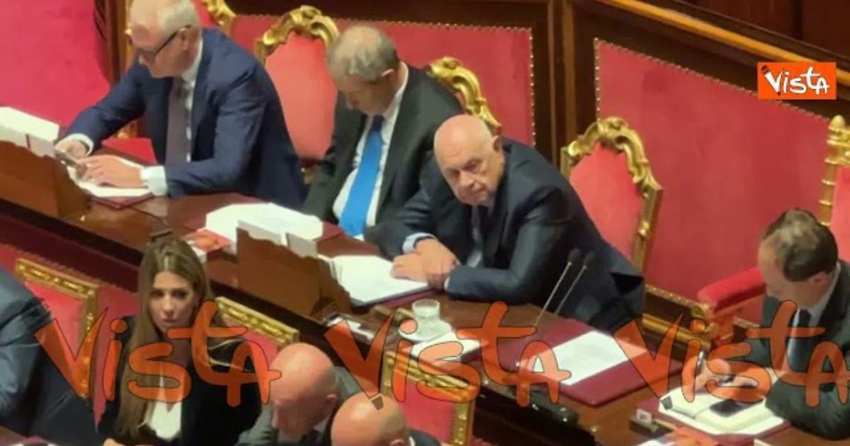 Il Guardasigilli Carlo Nordio tra i banche del Governo in Aula al Senato durante le dichiarazioni di voto e la votazione della Riforma della Giustizia.