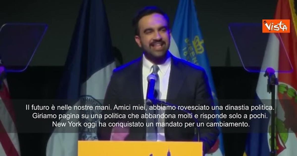 (Agenzia Vista) Usa, 05 novembre 2025 "II futuro è nelle nostre mani. Amici miei, abbiamo rovesciato una dinastia politica. Giriamo pagina su una politica che abbandona molti e risponde solo a pochi. New York oggi ha conquistato un mandato per un cambiamento", così Zohran Mamdani, primo sindaco musulmano eletto a New York, nel suo discorso dopo la vittoria. X Fonte: Agenzia Vista / Alexander Jakhnagiev