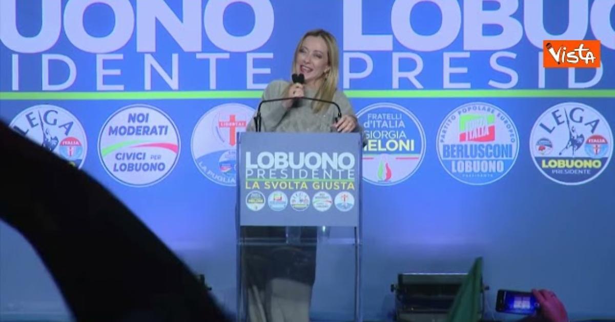 La premier Meloni accolta da cori e applausi sul palco di Bari per il comizio, a sostegno di Luigi Lobuono per le regionali in Puglia, grida al pubblico "Vi voglio bene"