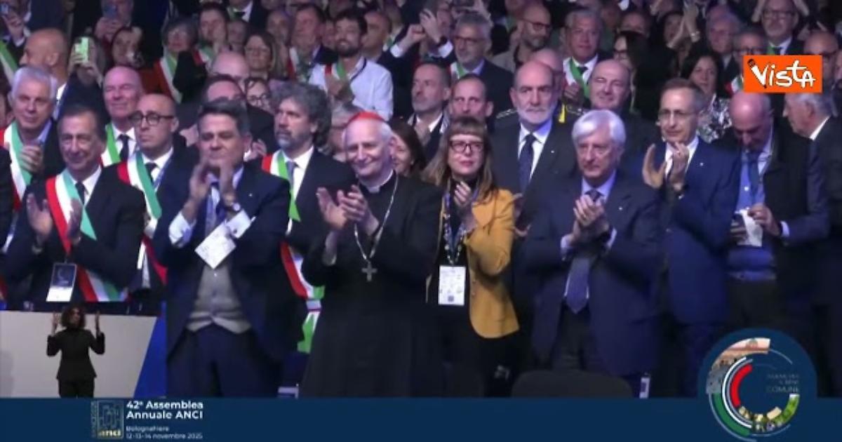 (Agenzia Vista) Bologna, 08 novembre 2025 Un lunga standing ovation dell'Assemblea Anci per Mattarella, salito sul palco a Bologna per il suo intervento. Anci Fonte: Agenzia Vista / Alexander Jakhnagiev