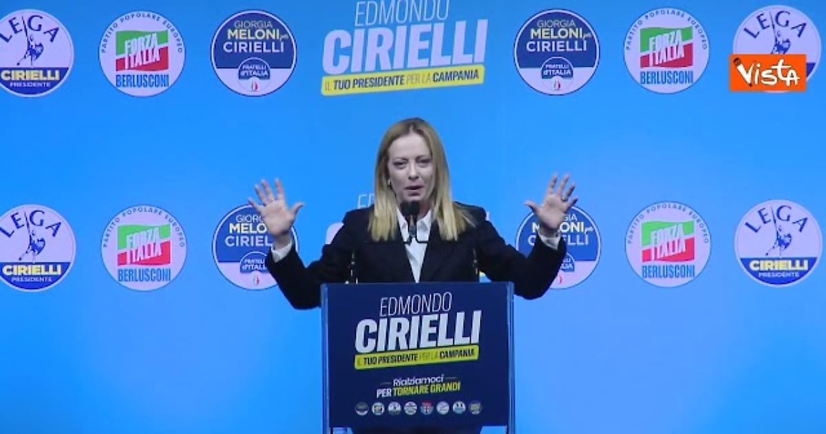 "Noi siamo tutti scemi a cospetto del genio, ma solo che questo si chiama gioco delle tre carte perchè De Luca cita volutamente solo le urgenti e brevi che sono notoriamente una quantità limitata e non dice cosa accade nelle altre classi che sono circa 80% delle prestazioni totali, lui non ve lo dice ma io si perchè si sa che sono un po' str...", così Giorgia Meloni al comizio del centrodestra a Napoli a sostegno di Edmondo Cirielli.