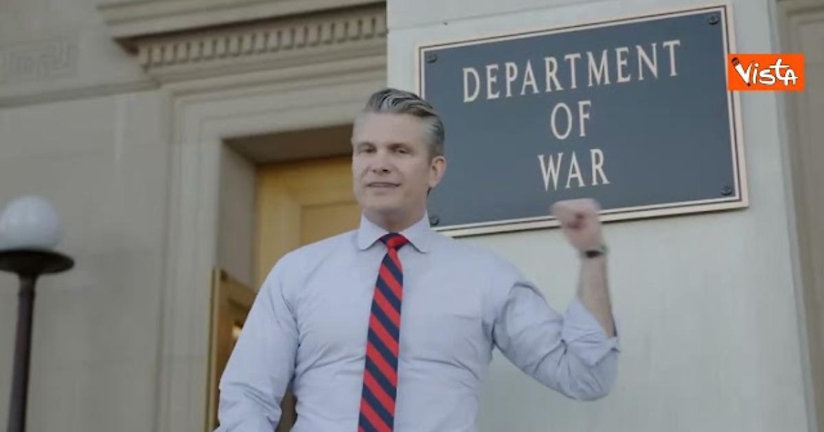 (Agenzia Vista) Usa, 15 novembre 2025 Il Segretario della Difesa Pete Hegseth ha installato di persona la nuova targa in bronzo all’ingresso cerimoniale del Pentagono, riportando la scritta “Dipartimento della Guerra”, come era noto prima del 1947. Un gesto simbolico che richiama la storia e la missione militare degli Stati Uniti, suscitando curiosità e commenti tra esperti e media. X Fonte: Agenzia Vista / Alexander Jakhnagiev