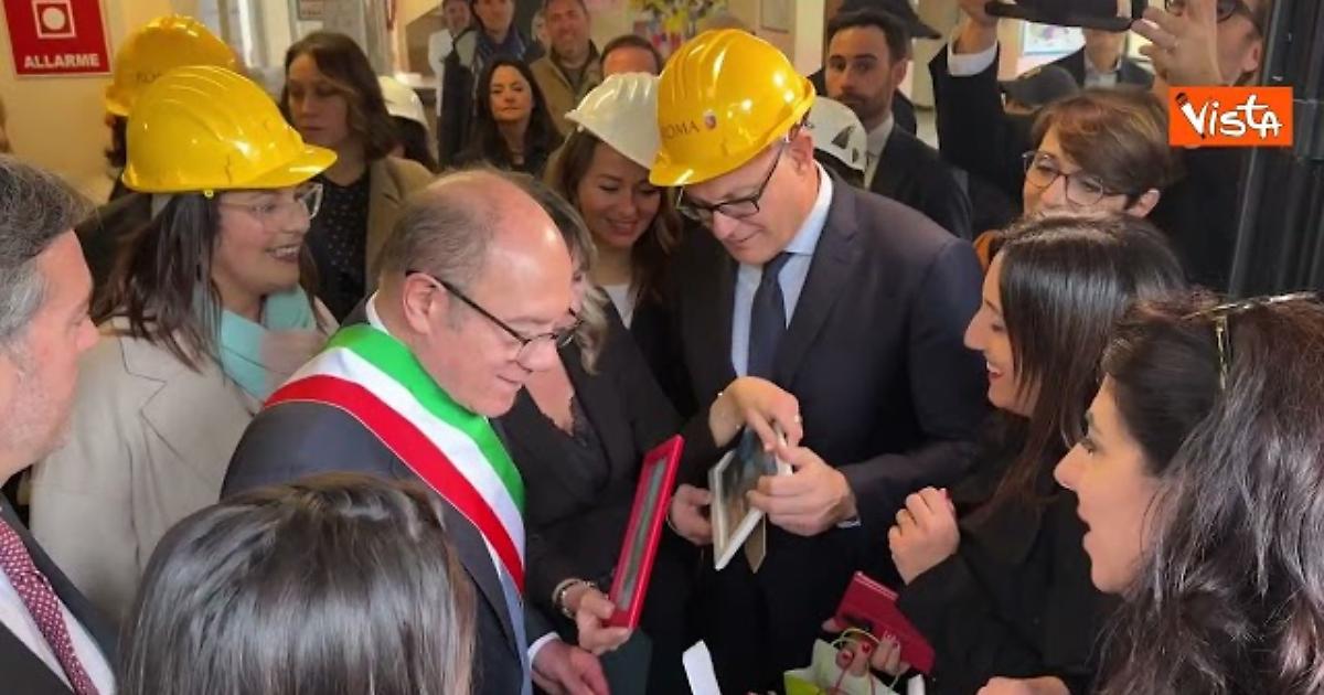 Verdone "sindaco per un giorno", accompagnato da Gualtieri, in visita alla scuola primaria di via Romolo Balzani, danneggiata dalla recente esplosione avvenuta in via dei Gordiani, con il caschetto di sicurezza in testa.