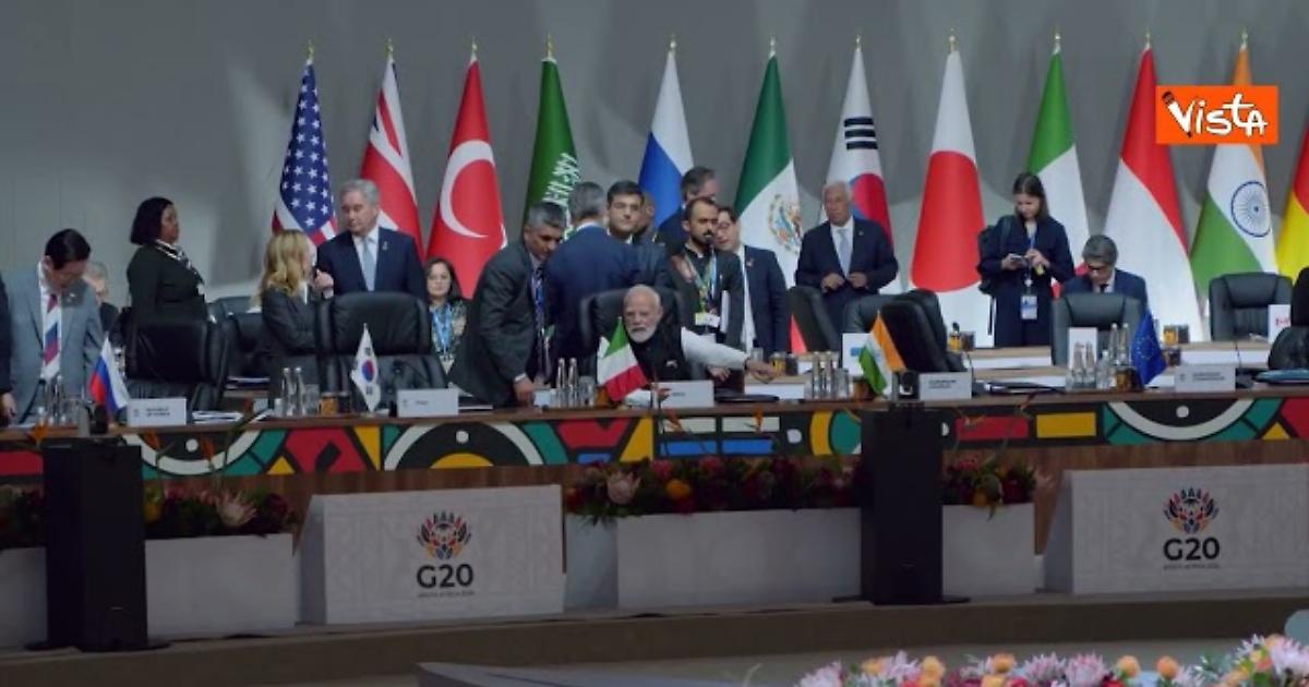 La lunga e calorosa stretta di mano di Giorgia Meloni con il premier indiano Modi a Johannesburg, al vertice G20 del Sudafrica.