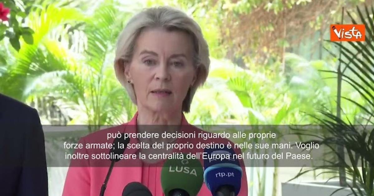 (Agenzia Vista) Luanda, 24 novembre 2025 "L’incontro odierno a Luanda ha confermato che siamo uniti nel nostro sostegno all’Ucraina. Il territorio e la sovranità dell’Ucraina devono essere rispettati. Solo l’Ucraina, come Paese sovrano, può prendere decisioni riguardo alle proprie forze armate; la scelta del proprio destino è nelle sue mani. Voglio inoltre sottolineare la centralità dell’Europa nel futuro del Paese. Continueremo a impegnarci domani, insieme ai nostri partner della coalizione dei volontari. Ho sollevato la questione dei bambini ucraini rapiti e scomparsi, ognuno di loro deve tornare a casa". Lo ha detto la presidente della Commissione Ue Ursula von der Leyen in un punto stampa da Luanda. Ebs Fonte: Agenzia Vista / Alexander Jakhnagiev