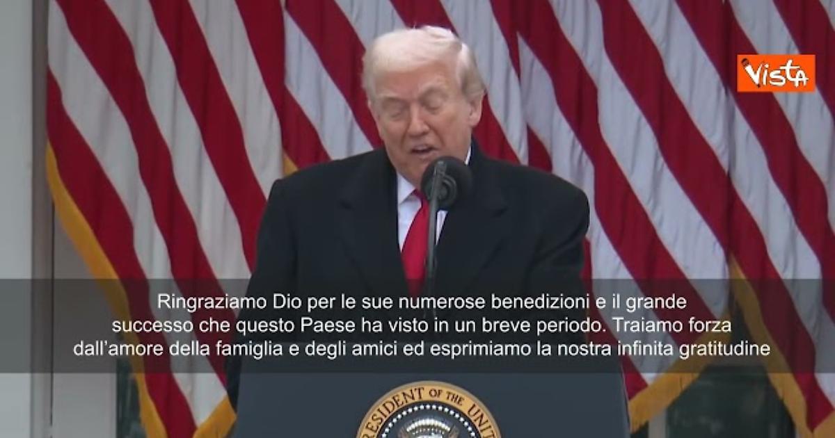 (Agenzia Vista) Usa, 25 novembre 2025 "Ho posto fine a otto guerre in nove mesi e stiamo lavorando all'ultima. Non è facile. Tra Ucraina e Russia, nell'ultimo mese sono morti 25mila soldati. Penso che ci stiamo avvicinando molto a un accordo. Lo scopriremo. Pensavo sarebbe stato più facile, ma penso che faremo progressi in meno di un anno. Abbiamo realizzato più di quanto la maggior parte delle altre amministrazioni abbia realizzato in otto anni e questo è un Giorno del Ringraziamento molto speciale. Ringraziamo Dio per le sue numerose benedizioni e il grande successo che questo Paese ha visto in un breve periodo. Traiamo forza dall’amore della famiglia e degli amici ed esprimiamo la nostra infinita gratitudine per gli uomini e le donne delle Forze Armate degli Stati Uniti. Li adoriamo. Preghiamo affinché la pace e la prosperità continuino a benedire la nostra terra. Renderemo di nuovo grande l’America. MAGA, la miglior espressione della storia della politica", lo ha detto Donald Trump alla casa Bianca, alla cerimonia per graziare i tacchini in occasione del Ringraziamento. White House Fonte: Agenzia Vista / Alexander Jakhnagiev