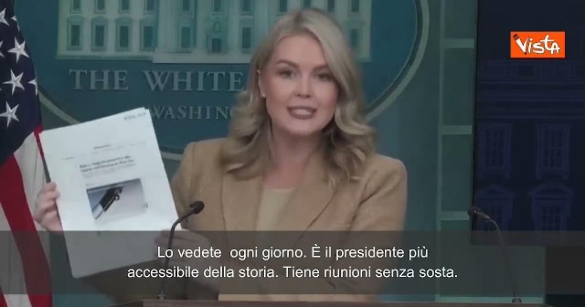 "Prima di lasciarvi andare vi prendo una storia falsa pubblicata dal New York Times. È stato preso 1/3 del programma quotidiano del Presidente ed è stato scritto che fa meno di quanto faceva nel suo primo mandato. È falso. È sfortunato che la storia sia stata scritta dalla stessa agenzia e dalla stessa giornalista che scrisse di Trump e del suo inciampo dall’Air Force One. State scherzando? Lavora ogni singolo giorno, è il Presidente più accessibile di tutti e tiene riunioni 24 ore su 24. In un altro si scrive che Biden abbia superato la sua prima visita medica presidenziale e che stia bene. Io non vedo titoli sul Presidente di questo tipo. Ricordo che è la stessa agenzia e la stessa giornalista che ha scritto che il Presidente Trump non è pronto per il suo lavoro" così Karoline Leavitt, portavoce del Presidente degli Stati Uniti Donald Trump, in una dichiarazione alla Casa Bianca.