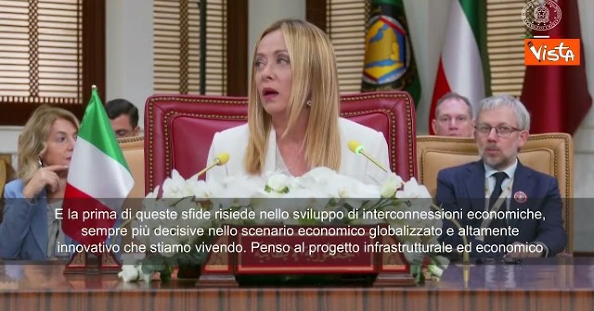 (Agenzia Vista) Bahrein, 03 dicembre 2025 "Siamo pronti a lavorare con voi a un Gcc-Med Summit che, ovviamente, sono pronta a ospitare in Italia, una nazione storicamente e geograficamente al centro di questi spazi, per creare questo nuovo e ambizioso formato di dialogo tra le nazioni del Golfo e del Mediterraneo. Sappiamo tutti che l’importanza del nostro spazio condiviso è destinata solo ad aumentare e che abbiamo bisogno di un dialogo più strutturato, capace di portare a una cooperazione rafforzata, se vogliamo che tutti noi possiamo sfruttare appieno le opportunità offerte dalla nostra centralità geopolitica. L’obiettivo deve essere la costruzione di una piattaforma operativa comune, concentrandoci sulle sfide in cui possiamo fare la differenza insieme. E la prima di queste sfide risiede nello sviluppo di interconnessioni economiche, sempre più decisive nello scenario economico globalizzato e altamente innovativo che stiamo vivendo. Penso al progetto infrastrutturale ed economico India–Middle East Corridor per collegare le principali città portuali dell’India, del Medio Oriente e dell’Europa, consentendo l’interconnessione con gli Usa. Questa iniziativa permetterebbe alle nostre economie e imprese di sprigionare un potenziale enorme". Lo ha detto la Presidente del Consiglio Giorgia Meloni nel suo intervento al Vertice di cooperazione del Golfo, in Bahrein. Chigi Fonte: Agenzia Vista / Alexander Jakhnagiev