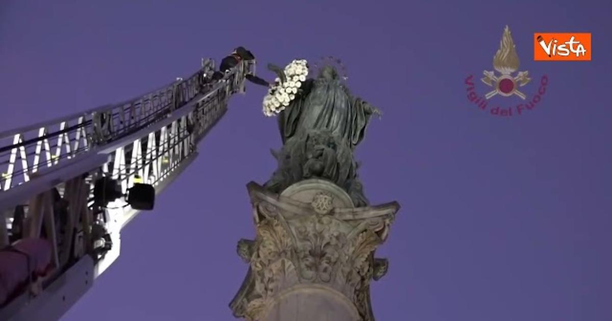 Il tradizionale omaggio dei Vigili del Fuoco alla Madonna a piazza di Spagna con la corona di fiori