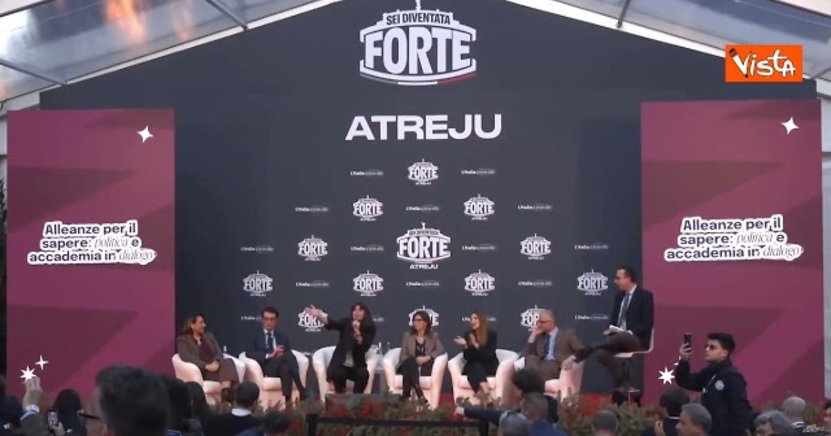 (Agenzia Vista) Roma, 11 dicembre 2025 "Mi permettete una citazione storica? Sapete cosa diceva Berlusconi? Siete sempre e solo dei poveri comunisti. Imparate ad ascoltare prima di contestare. Fatemi parlare prima di contestare. Questo dimostra tutta la vostra inutilità. Siete inutili" così la Ministra Bernini, venendo contestata ad Atreju. Fonte: Agenzia Vista / Alexander Jakhnagiev