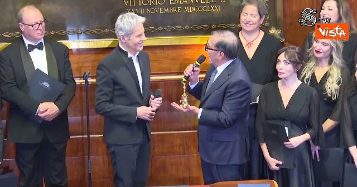 (Agenzia Vista) Roma, 22 dicembre 2025 Nel corso del concerto di Natale in Senato, Claudio Baglioni ha ricevuto dal presidente del Senato Ignazio La Russa la Martinella, campanella simbolo storico del Senato, come riconoscimento per la sua carriera e per l'ideazione del "GrandTour La vita è adesso". "Potrebbe essere anche una 'Jingle bell', una composizione natalizia", ha detto il cantautore facendo suonare la campanella. Senato Fonte: Agenzia Vista / Alexander Jakhnagiev
