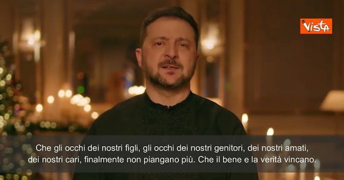 "Caro popolo, da tempi antichi gli ucraini hanno creduto che nella notte di Natale i cieli si aprano. E se si racconta loro il proprio sogno, esso certamente si realizzerà. Oggi il sogno di tutti noi è uno solo. E un solo desiderio esprimeremo, per tutti. 'Che lui (Putin) muoi', ognuno di noi dice tra sé e sé. Ma quando ci rivolgiamo a Dio, naturalmente chiediamo di più. Chiediamo la pace per l’Ucraina. Per questo lottiamo. E per questo preghiamo. E ce lo meritiamo. Che ogni famiglia ucraina viva nell’armonia. Che ogni bambino ucraino gioisca di un regalo, sorrida, conservi quella così importante fede infantile nel bene e nel miracolo. Che gli occhi dei nostri figli, gli occhi dei nostri genitori, dei nostri amati, dei nostri cari, finalmente non piangano più. Che il bene e la verità vincano. Che ci sia la vittoria della pace. Che ci siamo noi. E che ci sia l’Ucraina. E che arrivi immancabilmente il giorno in cui tutti si riuniranno a casa, nel primo anno di pace di un Natale di pace, e si diranno l’un l’altro: 'Cristo è nato! Glorifichiamolo!'. Auguro buone feste a tutti voi, cari ucraini e care ucraine, a ciascuno e a ciascuna. Vi auguro un Natale felice, una kutja gustosa e, naturalmente, la pace per tutti noi. Abbiate cura di voi, abbiate cura delle vostre famiglie, abbiate cura della nostra Ucraina. Cristo è nato! Glorifichiamolo" così il presidente dell'Ucraina Zelensky, nel suo discorso di Natale.