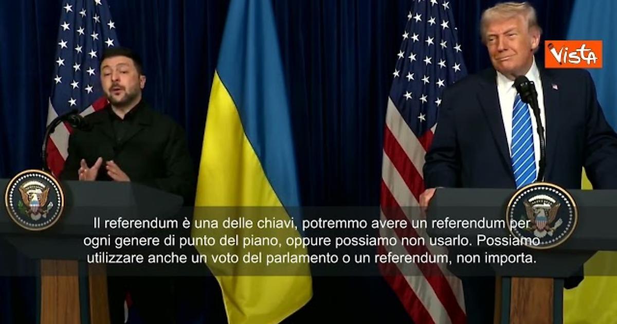 (Agenzia Vista) Usa, 28 dicembre 2025 È una questione difficile, conoscete la nostra posizione e dobbiamo rispettare la nostra legge e il nostro popolo e il territorio che controlliamo. La nostra attitudine è molto chiara e abbiamo posizioni diverse con la Russia. Il referendum è una delle chiavi, potremmo avere un referendum per ogni genere di punto del piano, oppure possiamo non usarlo. Possiamo utilizzare anche un voto del parlamento o un referendum, non importa. Se il piano sarà molto difficile per la nostra società, è la società che deve scegliere perché è la sua terra", lo ha detto Zelensky WhiteHouse Fonte: Agenzia Vista / Alexander Jakhnagiev