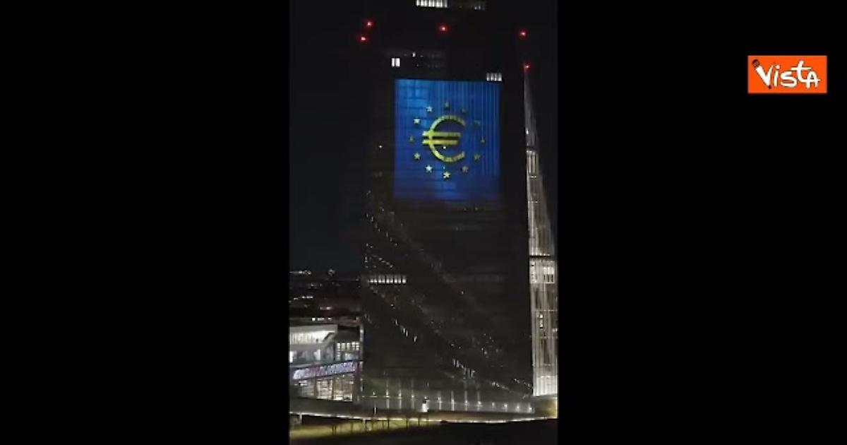 La bandiera della Bulgaria sul Palazzo della Bce a Francoforte per l'ingresso nell'Euro