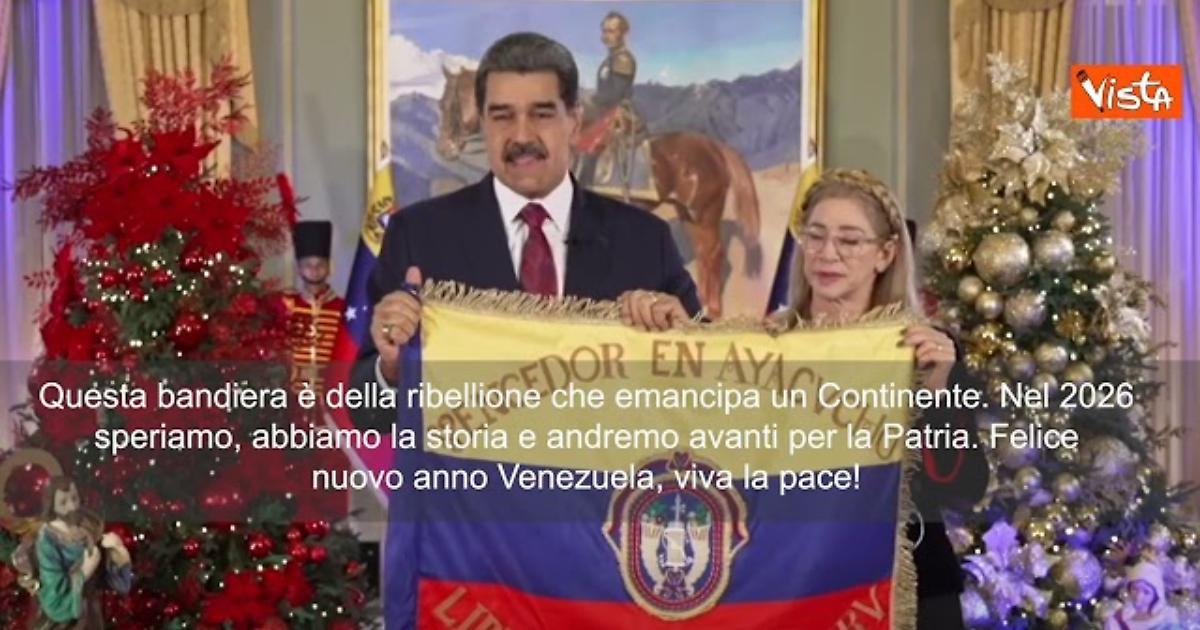 (Agenzia Vista) Caracas, Venezuela, 03 gennaio 2026 “Il nostro destino è quello di un grande Venezuela, di un’Unione Sudamericana. Di un Sud America emancipato dai domini imperiali e coloniali. Ti lascio questa bandiera per abbracciarla tutti. E la bandiera della ribellione che emancipa un continente. Nel 2026 speriamo, abbiamo storia e andremo avanti per la Patria. Felice nuovo anno Venezuela, viva la pace!”. Così il Presidente del Venezuela Nicolas Maduro nel suo discorso di auguri per il nuovo anno. Courtesy: Facebook Nicolas Maduro Fonte: Agenzia Vista / Alexander Jakhnagiev