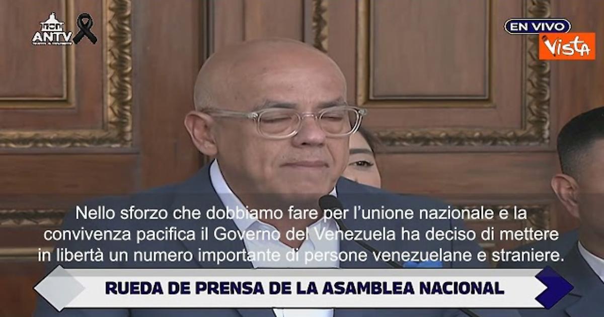 (Agenzia Vista) Caracas, 08 gennaio 2026 “Nello sforzo che dobbiamo fare per l’unione nazionale e la convivenza pacifica il Governo del Venezuela ha deciso di mettere in libertà un numero importante di persone venezuelane e straniere. Il processo di scarcerazione sta avvenendo proprio da questo momento. Considerate questo gesto del Governo di ampia intenzione per la pace. E per la vita pacifica del Venezuela”. Lo ha comunicato il Presidente dell’Assemblea del Venezuela Jorge Rodriguez in una conferenza stampa. Courtesy: ANTV Venezuela Fonte: Agenzia Vista / Alexander Jakhnagiev