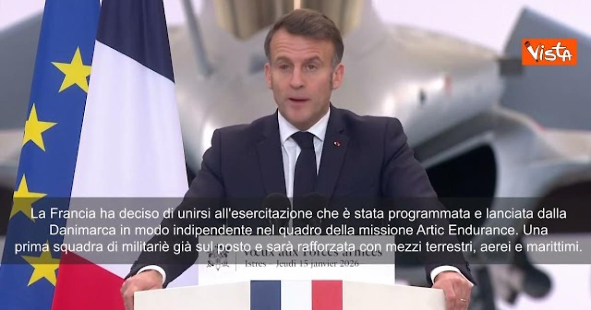 (Agenzia Vista) Francia, 15 gennaio 2026 "Gli europei hanno una responsabilità particolare in Groenlandia. La Francia e gli europei devono continuare ovunque i loro interessi vengono minacciati, ad essere presenti. Senza escalation, ma senza cedimenti sul rispetto della sovranità territoriale. La Francia ha deciso di unirsi all'esercitazione che è stata programmata e lanciata dalla Danimarca in modo indipendente nel quadro della missione Artic Endurance. Una prima squadra di militari è già sul posto e sarà rafforzata con mezzi terrestri, aerei e marittimi. In Groenlandia, territorio autonomo del regno di Danimarca, gli europei hanno una responsabilità particolare. Poiché quel territorio appartiene all'Unione europea, ed è di uno dei nostri alleati della Nato". Così il Presidente francese Macron durante il suo discorso alla base militare di Istres. Elysee Fonte: Agenzia Vista / Alexander Jakhnagiev