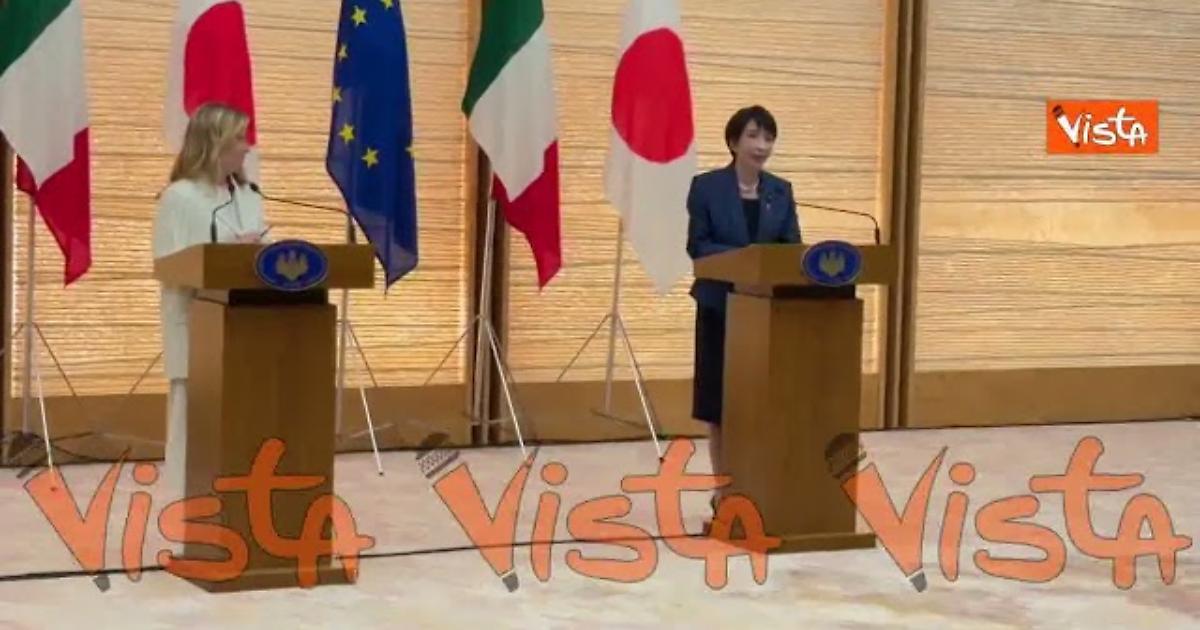 La premier giapponese Takaichi fa gli auguri di compleanno a Meloni durante il punto stampa al Kantei, sede ufficiale del Primo ministro nipponico, a Tokyo, la delegazione giapponese applaude alla premier italiana.
