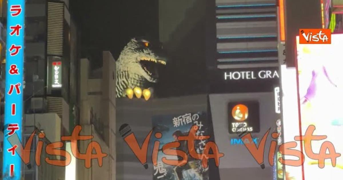 La testa di Godzilla sporge dall'edificio del cinema Toho di Tokyo e ruggisce a orari prestabiliti.