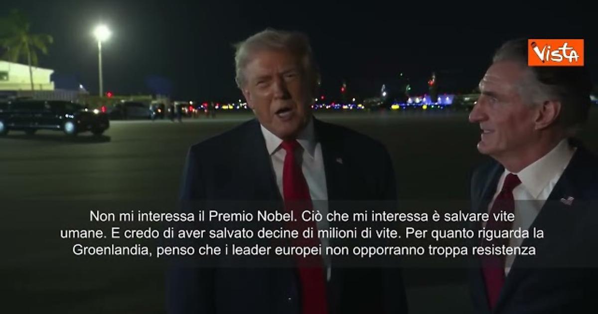 “Non mi interessa il Premio Nobel. Ciò che mi interessa è salvare vite umane. E credo di aver salvato decine di milioni di vite. Per quanto riguarda la Groenlandia, penso che i leader europei non opporranno troppa resistenza”. Così il Presidente Usa Donald Trump, in partenza da Miami per il Forum economico mondiale di Davos, in Svizzera.